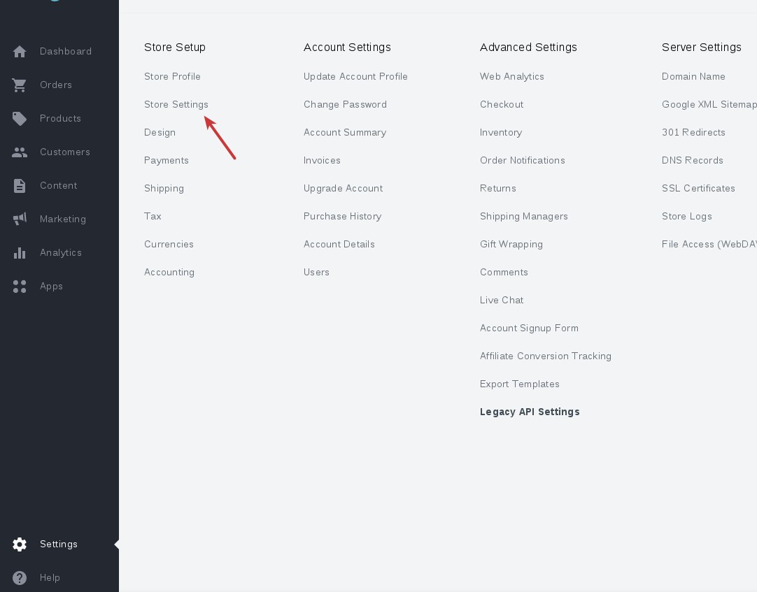 1. Once you've logged into your BigCommerce store's control panel, go to Settings.