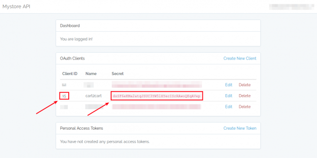 - Etter at du har opprettet “new client”, kopier Client ID og Secret og lim dette inn i de samsvarende feltene i Cart2Cart Migration Wizard.
