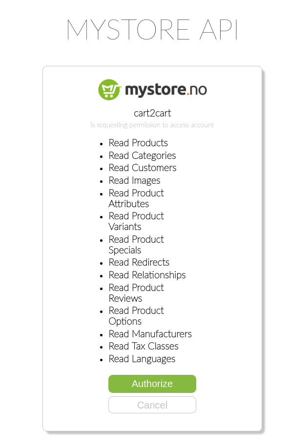 - Click “Authorize” to permit Cart2Cart to access your Mystore.no store.