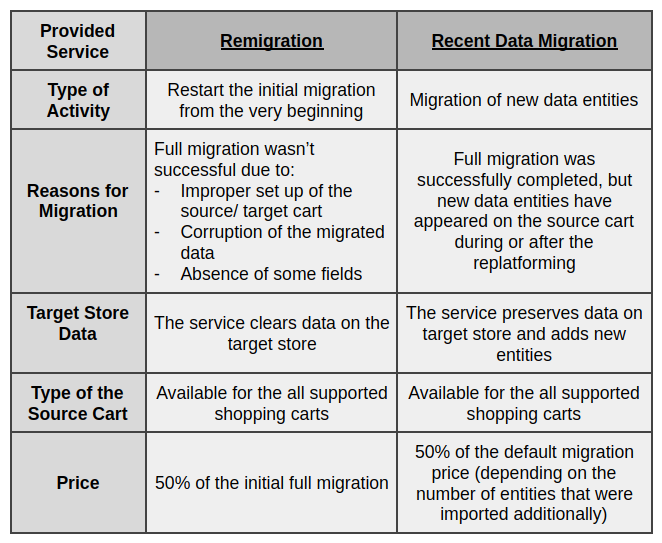 Remigration and Recent Data Migration services are usually confused since they both can be launched after the Full Migration and have similar pricing model. However, the difference between them is crucial. Please, take a look at the comparative table: