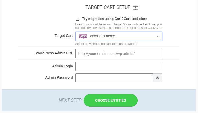 Select WooCommerce as your Target Cart. Provide all the necessary credentials (WordPress Admin URL, login, and password) and click the "Choose entities" button.