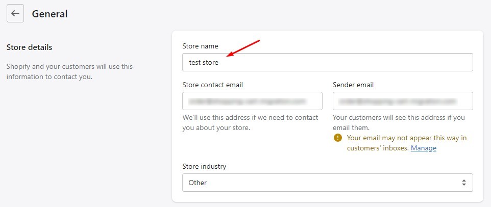 The first subsection you'll see on the General page is your Store details. Next, in the first text box, you'll see your store name. Here, you can enter your new store name.