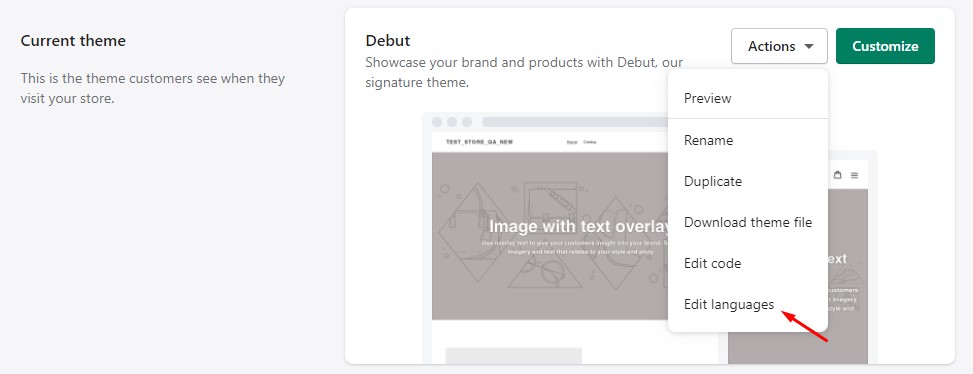 - Find the theme you want to edit, select Actions, and then Edit languages.