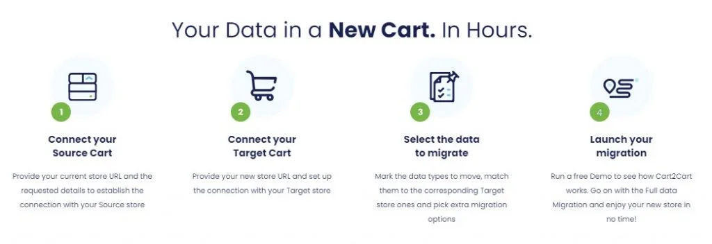 To get a free demo of how it works, all you have to do is sign up to Cart2Cart at no cost whatsoever. The best part about this service is β you get to pay only for the data you migrate β no more, no less.