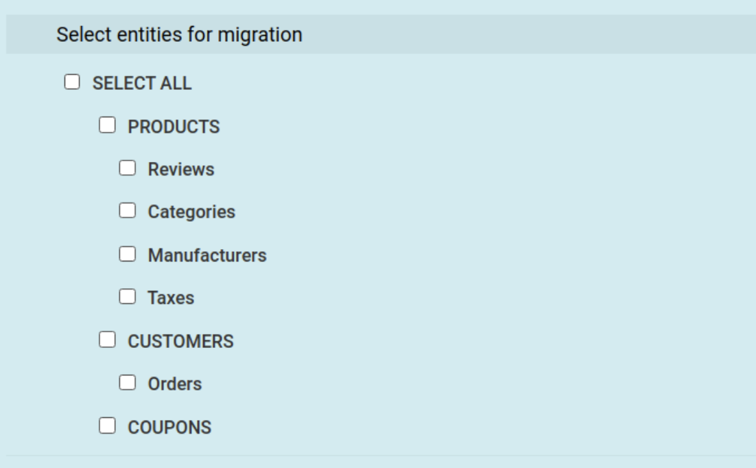 Select "All entities" for a comprehensive transfer, or pick individual items according to your specific needs. Note that for reviews, you'll need to leverage a specific Shopify app like AirReviews post-migration.